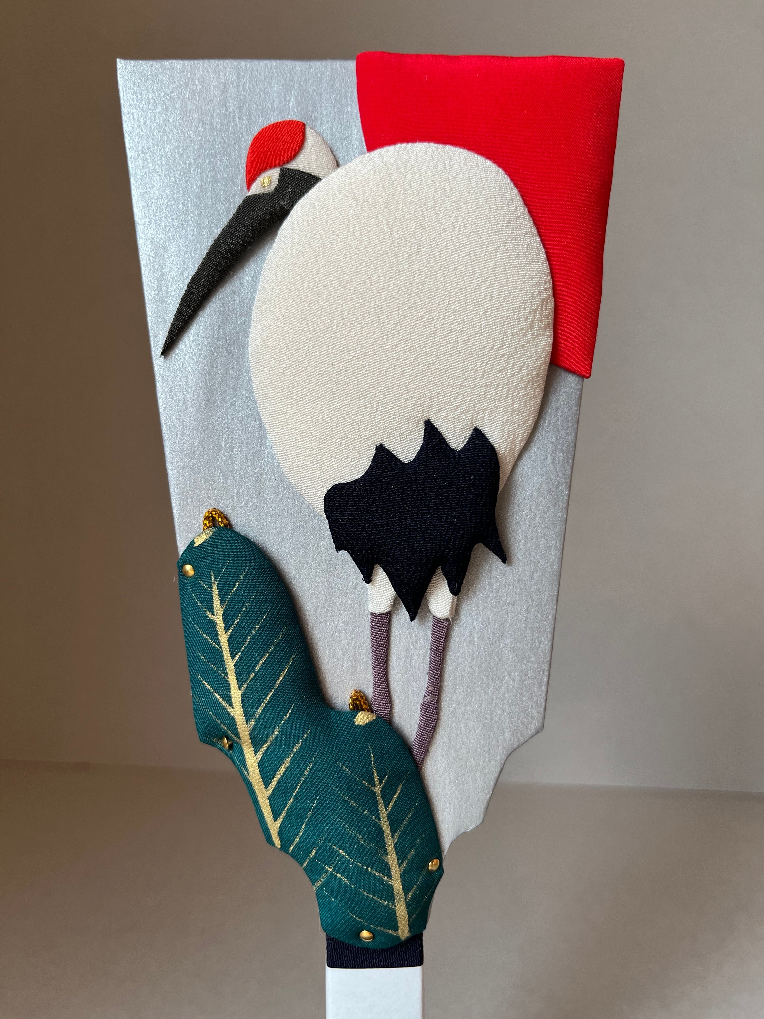 おめでたい鶴と松をモチーフとした押絵羽子板です